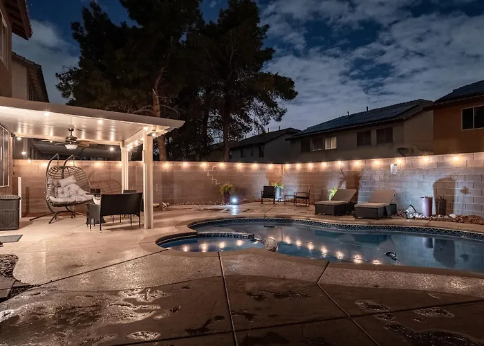 La 5Br 3Ba Family Friendly Entire Home W Pool, Spa, Games, Tvs, And More dispone de un hervidor eléctrico, un lavaplatos y un horno en una cocina bien equipada para cocinar. Los huéspedes pueden disfrutar de una comida en el restaurante Jack in the Box, situado a tan solo 14 minutos a pie. El aeropuerto internacional Mccarran de Las Vegas está a 19 minutos en coche de la villa.